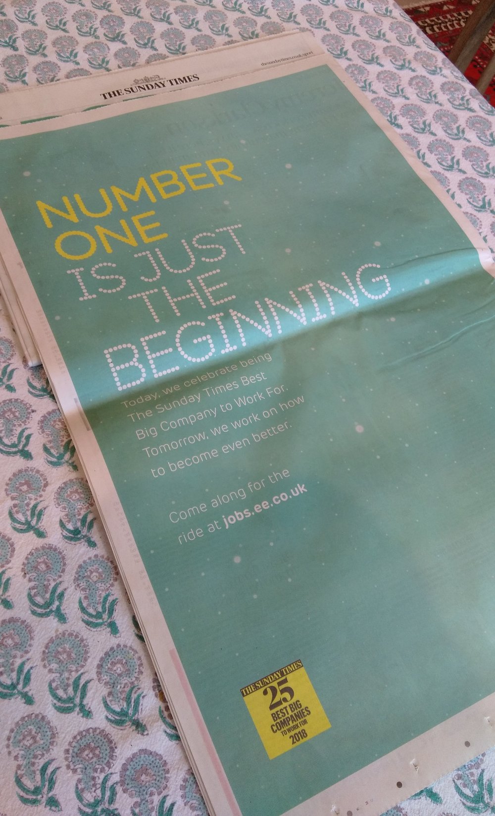 This month, EE won the Sunday Times Best Big Companies to Work For competition. We wrote an ad for the back of the paper to celebrate.
